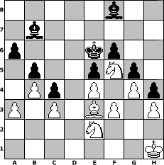 game notation in PGN-format [Event "Februar 2017"] [Site "www.myChess.de"] [Date "2017.02.05"] [Round "1"] [White "Master1"] [Black "Seneca"] [ECO "A41"] [WhitemyELO "1313"] [BlackmyELO "1526"] [Result "1/2-1/2"] [TimeControl "10/1728000"] [WhiteDays "79"] [BlackDays "56"] [MyChessNo "106759"] 1. d4 d6 2. e3 Nf6 3. Bd3 g6 4. Nf3 Bg7 5. Nbd2 O-O 6. O-O a6 7. Re1 c6 8. e4 b5 9. c3 Bb7 10. b3 Qc7 11. h3 Nbd7 12. Rb1 e5 13. dxe5 dxe5 14. Nf1 Rad8 15. Bg5 Nc5 16. Re3 Nxd3 17. Rxd3 Rxd3 18. Qxd3 Nd7 19. b4 f6 20. Bh4 g5 21. Bg3 Nb6 22. Ne3 Rd8 23. Qc2 Bc8 24. Nd4 c5 25. Ne2 c4 26. a3 h5 27. Rd1 Rxd1+ 28. Nxd1 h4 29. Bh2 Qd6 30. f3 Kf7 31. Nf2 Bf8 32. Kh1 Be7 33. g4 Nd7 34. Qd1 Qb6 35. Qd5+ Kg7 36. Bg1 Qd6 37. Qxd6 Bxd6 38. Nd1 Nb6 39. Bxb6 Kf7 40. Bf2 Ke6 41. Ne3 Be7 42. Nf5 Bf8 43. Nc1 Bb7 44. Be3 Bc6 45. Ne2 Bb7 1/2-1/2 position notation in FEN-format 5b2/1b6/p3kp2/1p2pNp1/1Pp1P1Pp/P1P1BP1P/4N3/7K - - - 13 46 Captured white pieces: Captured black pieces: Click on a captured piece in order to display the desired move!