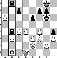game notation in PGN-format [Event "Dabei ist alles 4"] [Site "www.myChess.de"] [Date "2008.08.25"] [Round "1"] [White "Naunhofer"] [Black "reisinger"] [ECO "D06"] [WhitemyELO "1622"] [BlackmyELO "1432"] [Result "1-0"] [TimeControl "10/864000"] [WhiteDays "06"] [BlackDays "10"] [MyChessNo "47473"] 1. d4 d5 2. c4 Bf5 3. Nc3 e6 4. Nf3 Nf6 5. e3 Bb4 6. Bd2 Ne4 7. Nxe4 dxe4 8. Bxb4 exf3 9. Qxf3 Nc6 10. Ba3 a5 11. Be2 Nb4 12. Bxb4 axb4 13. Qxb7 O-O 14. Qxb4 Qf6 15. O-O Rfb8 16. Qd2 Ra7 17. b3 Qg5 18. f4 Qg6 19. Bf3 h5 20. Qe2 h4 21. h3 Bd3 22. Qd1 Bxf1 23. Kxf1 Qg3 24. a4 Ra6 25. Ke2 Rab6 26. Rb1 Rb4 27. a5 Qg6 28. a6 1-0 position notation in FEN-format 1r4k1/2p2pp1/P3p1q1/8/1rPP1P1p/1P2PB1P/4K1P1/1R1Q4 - - - 0 28 Captured white pieces: Captured black pieces: Click on a captured piece in order to display the desired move!
