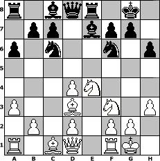 game notation in PGN-format [Event "Spass am Schach Runde 2"] [Site "www.myChess.de"] [Date "2011.07.01"] [Round "2"] [White "gunni50"] [Black "lasker"] [ECO "D30"] [WhitemyELO "1236"] [BlackmyELO "1270"] [Result "1-0"] [TimeControl "10/1728000"] [WhiteDays "20"] [BlackDays "00"] [MyChessNo "74898"] 1. d4 d5 2. c4 e6 3. cxd5 exd5 4. Nf3 Nf6 5. h3 Be7 6. e3 O-O 7. Bd3 Nc6 8. O-O Re8 9. Nc3 h6 10. a3 a6 11. e4 dxe4 12. Nxe4 1-0 position notation in FEN-format r1bqr1k1/1pp1bpp1/p1n2n1p/8/3PN3/P2B1N1P/1P1P1PP1/R1BQ1RK1 - - - 0 12 Captured white pieces: Captured black pieces: Click on a captured piece in order to display the desired move!
