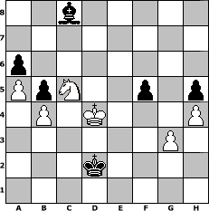 game notation in PGN-format [Event "Auf gehts,zum Turnier.Enginefrei,mit einem Bier."] [Site "www.myChess.de"] [Date "2017.09.25"] [Round "1"] [White "Rabenvogel"] [Black "miu"] [ECO "A45"] [WhitemyELO "1498"] [BlackmyELO "1530"] [Result "1/2-1/2"] [TimeControl "10/864000"] [WhiteDays "10"] [BlackDays "10"] [MyChessNo "109668"] 1. d4 Nf6 2. Nc3 e6 3. Bg5 d5 4. e3 c5 5. Nf3 a6 6. Bd3 b5 7. dxc5 Nc6 8. a3 Bxc5 9. O-O O-O 10. e4 dxe4 11. Bxe4 Bb7 12. Qxd8 Raxd8 13. Bxf6 gxf6 14. b4 Be7 15. Rfe1 f5 16. Bxc6 Bxc6 17. Ne5 Bb7 18. Red1 Bf6 19. f4 Bxe5 20. fxe5 f6 21. exf6 Kf7 22. Rxd8 Rxd8 23. Rd1 Rxd1+ 24. Nxd1 Kxf6 25. Kf2 Ke5 26. g3 Kd4 27. Ke2 h5 28. c3+ Ke4 29. Nf2+ Kd5 30. Nd3 e5 31. Nc5 Bc8 32. a4 e4 33. a5 Kc4 34. Kd2 e3+ 35. Kxe3 Kxc3 36. Nd3 Kc2 37. Kd4 Bb7 38. Nc5 Bc8 39. h4 Kd2 40. Nd3 Bb7 41. Nc5 Bc8 1/2-1/2 position notation in FEN-format 2b5/8/p7/PpN2p1p/1P1K3P/6P1/3k4/8 - - - 5 42 Captured white pieces: Captured black pieces: Click on a captured piece in order to display the desired move!