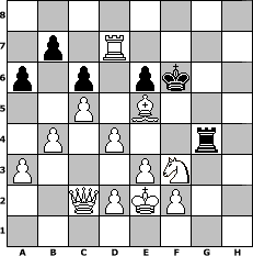 game notation in PGN-format [Event "Prätorianer"] [Site "www.myChess.de"] [Date "2023.01.04"] [Round "1"] [White "Mynona"] [Black "Achimkogge"] [ECO "D00"] [WhitemyELO "1458"] [BlackmyELO "1307"] [Result "1-0"] [TimeControl "10/1728000"] [WhiteDays "20"] [BlackDays "20"] [MyChessNo "128918"] 1. d4 d5 2. Bf4 Nc6 3. e3 Nf6 4. h3 Bf5 5. g4 Nb4 6. gxf5 h5 7. a3 Na6 8. c4 e6 9. fxe6 fxe6 10. c5 c6 11. Qa4 Ne4 12. Bg2 Kf7 13. Bxe4 dxe4 14. Nc3 h4 15. Nxe4 Rh5 16. Nf3 Be7 17. b4 g5 18. Bh2 Qd5 19. Qc2 Kg7 20. Be5+ Kh6 21. Ke2 Rg8 22. Nf6 Bxf6 23. Bxf6 g4 24. hxg4 Rxg4 25. Bxh4 Nc7 26. Bg3 Rxh1 27. Rxh1+ Kg7 28. Bxc7 Qd7 29. Rh7+ Kf6 30. Rxd7 a6 31. Be5# 1-0 position notation in FEN-format 8/1p1R4/p1p1pk2/2P1B3/1P1P2r1/P3PN2/2QPKP2/8 - - - 1 31 Captured white pieces: Captured black pieces: Click on a captured piece in order to display the desired move!