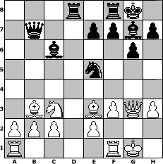 game notation in PGN-format [Event "K"] [Site "www.myChess.de"] [Date "2004.04.28"] [Round "1"] [White "Nightflight"] [Black "Gambitianer"] [ECO "B51"] [WhitemyELO "1605"] [BlackmyELO "1554"] [Result "0-1"] [TimeControl "10/3456000"] [WhiteDays "000"] [BlackDays "106"] [MyChessNo "4222"] 1. e4 c5 2. Nf3 d6 3. Bb5+ Nc6 4. d4 cxd4 5. Nxd4 Bd7 6. O-O g6 7. Be3 Bg7 8. Nc3 Nf6 9. f3 O-O 10. Nxc6 bxc6 11. Bc4 Qc7 12. Qd2 Rad8 13. Qf2 c5 14. e5 dxe5 15. Bxc5 e4 16. Bb3 exf3 17. gxf3 Bc6 18. Bxa7 Nd7 19. Be3 Ne5 20. Qg3 Qd7 21. h3 Qb7 0-1 position notation in FEN-format 3r1rk1/1q2ppbp/2b3p1/4n3/8/1BN1BPQP/PPP1P3/R4RK1 - - - 1 22 Captured white pieces: ![]() ![]() ![]() ![]() ![]() ![]() ![]() ![]() ![]() ![]() ![]() ![]() ![]() ![]() ![]() Captured black pieces: ![]() ![]() ![]() ![]() ![]() ![]() ![]() ![]() ![]() ![]() ![]() ![]() ![]() ![]() ![]() Click on a captured piece in order to display the desired move!