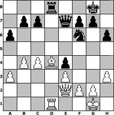 game notation in PGN-format [Event "Sommerlaune"] [Site "www.myChess.de"] [Date "2009.07.15"] [Round "1"] [White "deepsabel"] [Black "guinan"] [ECO "A50"] [WhitemyELO "1977"] [BlackmyELO "1537"] [Result "1/2-1/2"] [TimeControl "10/2592000"] [WhiteDays "50"] [BlackDays "64"] [MyChessNo "57528"] 1. d4 Nf6 2. c4 Nc6 3. Nf3 e6 4. Nc3 Bb4 5. Qc2 d6 6. Bd2 O-O 7. a3 Bxc3 8. Bxc3 Re8 9. Rd1 Qe7 10. e3 e5 11. dxe5 dxe5 12. Be2 Bg4 13. O-O Rad8 14. Rxd8 Rxd8 15. h3 Bh5 16. b4 e4 17. Nd4 Nxd4 18. Bxd4 Bxe2 19. Qxe2 a6 20. Rd1 h6 1/2-1/2 position notation in FEN-format 3r2k1/1pp1qpp1/p4n1p/8/1PPBp3/P3P2P/4QPP1/3R2K1 - - - 0 21 Captured white pieces: Captured black pieces: Click on a captured piece in order to display the desired move!