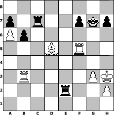 game notation in PGN-format [Event "Zug um Zug gegen Fr"] [Site "www.myChess.de"] [Date "2012.03.12"] [Round "1"] [White "espero"] [Black "nogumo"] [ECO "A45"] [WhitemyELO "1616"] [BlackmyELO "1648"] [Result "1-0"] [TimeControl "10/2592000"] [WhiteDays "114"] [BlackDays "000"] [MyChessNo "80566"] 1. d4 Nf6 2. Bg5 g6 3. Bxf6 exf6 4. c4 Bg7 5. Nc3 O-O 6. g3 f5 7. Bg2 d6 8. e3 c6 9. Nge2 Nd7 10. O-O Nb6 11. b3 Be6 12. Nf4 Re8 13. a4 Rc8 14. a5 Nd7 15. a6 b6 16. Qd2 Nf6 17. Rad1 Rc7 18. d5 cxd5 19. Ncxd5 Bxd5 20. Nxd5 Nxd5 21. Bxd5 Rc5 22. b4 Rc7 23. Qa2 Be5 24. c5 Qf6 25. f4 dxc5 26. fxe5 Qxe5 27. e4 cxb4 28. exf5 gxf5 29. Qd2 Qe3+ 30. Qxe3 Rxe3 31. Rxf5 b3 32. Rb1 Kg7 33. Rxb3 Re1+ 34. Kg2 Re2+ 35. Kh3 1-0 position notation in FEN-format 8/p1r2pkp/Pp6/3B1R2/8/1R4PK/4r2P/8 - - - 4 35 Captured white pieces: Captured black pieces: Click on a captured piece in order to display the desired move!
