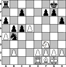 game notation in PGN-format [Event "R"] [Site "www.myChess.de"] [Date "2005.07.20"] [Round "1"] [White "GIM1961"] [Black "lasker"] [ECO "C55"] [WhitemyELO "1998"] [BlackmyELO "1514"] [Result "1-0"] [TimeControl "10/2592000"] [WhiteDays "65"] [BlackDays "34"] [MyChessNo "15247"] 1. e4 e5 2. Nf3 Nc6 3. Bc4 Nf6 4. d3 Bc5 5. Nc3 O-O 6. O-O d6 7. Bg5 h6 8. Bxf6 Qxf6 9. Nd5 Qd8 10. c3 Be6 11. d4 exd4 12. cxd4 a6 13. dxc5 dxc5 14. Re1 Re8 15. Rc1 b5 16. Bf1 Bxd5 17. Qxd5 Qxd5 18. exd5 Rxe1 19. Rxe1 Nb4 20. a4 1-0 position notation in FEN-format r5k1/2p2pp1/p6p/1ppP4/Pn6/5N2/1P2PPPP/4RBK1 - - - 0 20 Captured white pieces: Captured black pieces: Click on a captured piece in order to display the desired move!