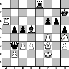 game notation in PGN-format [Event "Windecker Herbst-Open"] [Site "www.myChess.de"] [Date "2014.10.08"] [Round "1"] [White "UPS"] [Black "martinus"] [ECO "B23"] [WhitemyELO "1650"] [BlackmyELO "1726"] [Result "0-1"] [TimeControl "10/1728000"] [WhiteDays "20"] [BlackDays "20"] [MyChessNo "96196"] 1. e4 c5 2. Nc3 Nc6 3. Nf3 d6 4. h3 Nf6 5. Bb5 Bd7 6. O-O e5 7. d3 a6 8. Bxc6 Bxc6 9. Bg5 Be7 10. Qd2 O-O 11. Nh2 Qb6 12. Rab1 Rfe8 13. Kh1 h6 14. Be3 Qc7 15. f4 Nh5 16. Qf2 exf4 17. Bxf4 Nxf4 18. Qxf4 Bg5 19. Qf3 Re6 20. Rbd1 Rf6 21. Qe2 Rxf1+ 22. Rxf1 Re8 23. Qf2 b5 24. Ne2 Bf6 25. c3 d5 26. exd5 Bxd5 27. Nf4 Bxa2 28. Ra1 Bb3 29. Ng4 Bg5 30. g3 Bxf4 31. gxf4 Qc6+ 32. Kg1 f6 33. Qg3 h5 34. Nh6+ Kh7 35. Nf5 g6 36. Nh4 Bf7 37. Kf2 Qe6 38. Qf3 Qb3 39. Rxa6 Bd5 0-1 position notation in FEN-format 4r3/7k/R4pp1/1ppb3p/5P1N/1qPP1Q1P/1P3K2/8 - - - 1 40 Captured white pieces: Captured black pieces: Click on a captured piece in order to display the desired move!