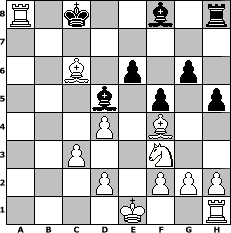 game notation in PGN-format [Event "Novemberturnier"] [Site "www.myChess.de"] [Date "2004.11.04"] [Round "1"] [White "Wormatia08"] [Black "Master1"] [ECO "D06"] [WhitemyELO "1541"] [BlackmyELO "1217"] [Result "1-0"] [TimeControl "10/2592000"] [WhiteDays "89"] [BlackDays "89"] [MyChessNo "7784"] 1. d4 d5 2. c4 Nf6 3. Nc3 Be6 4. cxd5 Nxd5 5. e4 Nxc3 6. bxc3 f5 7. e5 g6 8. Nf3 h5 9. Ng5 Qd7 10. Rb1 Bxa2 11. Rxb7 Nc6 12. e6 Qd5 13. Rxc7 Bb3 14. Qf3 Qxf3 15. Nxf3 Nd8 16. Bb5+ Nc6 17. Bxc6+ Kd8 18. Rd7+ Kc8 19. Bxa8 Bxe6 20. Rxa7 Kb8 21. Ra5 Bb3 22. Bf4+ Kc8 23. Ra7 e6 24. Bc6 Bd5 25. Ra8# 1-0 position notation in FEN-format R1k2b1r/8/2B1p1p1/3b1p1p/3P1B2/2P2N2/3P1PPP/4K2R - K - 3 25 Captured white pieces: Captured black pieces: Click on a captured piece in order to display the desired move!