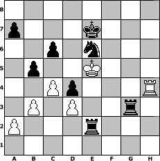 game notation in PGN-format [Event "Kellertunier"] [Site "www.myChess.de"] [Date "2005.08.15"] [Round "1"] [White "tuergeist"] [Black "thello"] [ECO "B11"] [WhitemyELO "1264"] [BlackmyELO "1394"] [Result "0-1"] [TimeControl "10/864000"] [WhiteDays "10"] [BlackDays "10"] [MyChessNo "16250"] 1. e4 c6 2. Nc3 d5 3. Nf3 d4 4. Na4 b5 5. Nc5 e5 6. d3 Bxc5 7. Bg5 Be7 8. h4 Bg4 9. Be2 Bxf3 10. Bxf3 Bxg5 11. hxg5 Qxg5 12. Rh5 Qf6 13. Rf5 Qd6 14. Bg4 Nh6 15. Rh5 Nxg4 16. Qxg4 Nd7 17. Qxg7 Qf6 18. Qxf6 Nxf6 19. Rf5 Nd7 20. O-O-O Rg8 21. g3 Rg6 22. Rh1 Nf8 23. b3 f6 24. f4 Rxg3 25. Rxf6 exf4 26. e5 f3 27. e6 Ke7 28. Rf1 Kxf6 29. e7 Kxe7 30. Kd1 Ne6 31. Ke1 h5 32. Rh1 Rh8 33. Kf2 h4 34. c4 Rhg8 35. Rxh4 Rg2+ 36. Kxf3 R8g3+ 37. Ke4 Re2+ 38. Kf5 Rf2+ 39. Ke5 Re2+ 0-1 position notation in FEN-format 8/p3k3/2p1n3/1p2K3/2Pp3R/1P1P2r1/P3r3/8 - - - 7 40 Captured white pieces: ![]() ![]() ![]() ![]() ![]() ![]() ![]() ![]() ![]() ![]() ![]() ![]() ![]() ![]() ![]() Captured black pieces: ![]() ![]() ![]() ![]() ![]() ![]() ![]() ![]() ![]() ![]() ![]() ![]() ![]() ![]() ![]() Click on a captured piece in order to display the desired move!