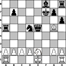 game notation in PGN-format [Event "Ja, is denn heut scho Weihnachten?"] [Site "www.myChess.de"] [Date "2014.12.06"] [Round "1"] [White "Mattheus"] [Black "MiFie"] [ECO "D00"] [WhitemyELO "1295"] [BlackmyELO "1052"] [Result "0-1"] [TimeControl "10/2592000"] [WhiteDays "57"] [BlackDays "53"] [MyChessNo "97039"] 1. d4 d5 2. e4 dxe4 3. Nc3 Nf6 4. f3 Bf5 5. Be3 Nc6 6. Bb5 a6 7. fxe4 axb5 8. exf5 e6 9. fxe6 fxe6 10. Nxb5 Ra5 11. Qe2 e5 12. dxe5 Nxe5 13. Bg5 h6 14. Qxe5+ Qe7 15. Nxc7+ Kf7 16. Nd5 Qxe5+ 17. Ne2 Nxd5 0-1 position notation in FEN-format 5b1r/1p3kp1/7p/r2nq1B1/8/8/PPPPN1PP/R3K2R - KQ - 0 18 Captured white pieces: ![]() ![]() ![]() ![]() ![]() ![]() ![]() ![]() ![]() ![]() ![]() ![]() ![]() ![]() ![]() Captured black pieces: ![]() ![]() ![]() ![]() ![]() ![]() ![]() ![]() ![]() ![]() ![]() ![]() ![]() ![]() ![]() Click on a captured piece in order to display the desired move!