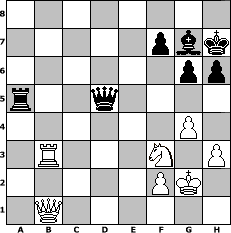 game notation in PGN-format [Event "80 Jahre Weltmeister Max Euwe"] [Site "www.myChess.de"] [Date "2015.07.20"] [Round "1"] [White "alibengali"] [Black "kalle"] [ECO "A04"] [WhitemyELO "1685"] [BlackmyELO "1637"] [Result "1/2-1/2"] [TimeControl "10/2592000"] [WhiteDays "100"] [BlackDays "133"] [MyChessNo "99781"] 1. Nf3 g6 2. e4 Bg7 3. d4 d6 4. Bc4 Nf6 5. e5 dxe5 6. Nxe5 O-O 7. O-O Nbd7 8. Nc3 c6 9. Bg5 Nb6 10. Bb3 Bf5 11. Re1 Nfd5 12. Nxd5 Nxd5 13. c4 Nc7 14. Nf3 Ne6 15. Bh4 Re8 16. d5 Nc5 17. Bc2 Bg4 18. Rb1 cxd5 19. cxd5 Qd6 20. b4 Na6 21. Ba4 Bd7 22. Bxd7 Qxd7 23. a3 Nc7 24. Bxe7 Nxd5 25. Bg5 Qf5 26. Bd2 Nc3 27. Bxc3 Bxc3 28. Rxe8+ Rxe8 29. h3 h6 30. g4 Qf6 31. Kg2 Rd8 32. Qf1 Qd6 33. Qc1 Bg7 34. a4 a6 35. b5 axb5 36. Rxb5 Rb8 37. Qb1 Qc6 38. a5 Ra8 39. Rb6 Qd5 40. Rxb7 Rxa5 41. Rb8+ Kh7 42. Rb3 1/2-1/2 position notation in FEN-format 8/5pbk/6pp/r2q4/6P1/1R3N1P/5PK1/1Q6 - - - 3 42 Captured white pieces: Captured black pieces: Click on a captured piece in order to display the desired move!