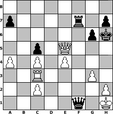 game notation in PGN-format [Event "Dezember-Turnier"] [Site "www.myChess.de"] [Date "2009.12.01"] [Round "1"] [White "Hobbykegler"] [Black "bluescreenlover"] [ECO "A10"] [WhitemyELO "1079"] [BlackmyELO "1313"] [Result "0-1"] [TimeControl "10/2592000"] [WhiteDays "94"] [BlackDays "75"] [MyChessNo "61102"] 1. c4 g6 2. Nc3 Bg7 3. Nf3 e5 4. d3 c5 5. Be3 Qb6 6. g3 d6 7. Nd5 Qa5+ 8. Nd2 Be6 9. Bg2 Nc6 10. O-O Nge7 11. Nxe7 Nxe7 12. Bxb7 Rb8 13. Nb3 Qb6 14. f4 Qxb7 15. Rc1 Bh3 16. Rf2 Nf5 17. Bd2 O-O 18. fxe5 Bxe5 19. Na5 Qxb2 20. Nc6 Rb6 21. Nxe5 dxe5 22. e4 Nd6 23. Bc3 Qa3 24. Bxe5 Qa5 25. a4 f6 26. Bxf6 Nxe4 27. dxe4 Rbxf6 28. Rxf6 Rxf6 29. Qd5+ Be6 30. Qa8+ Rf8 31. Qc6 Qd2 32. Qxe6+ Kg7 33. Qe7+ Rf7 34. Qe5+ Kh6 35. Rc3 Qf2+ 36. Kh1 Qf1# 0-1 position notation in FEN-format 8/p4r1p/6pk/2p1Q3/P1P1P3/2R3P1/2P4P/5q1K - - - 9 37 Captured white pieces: Captured black pieces: Click on a captured piece in order to display the desired move!
