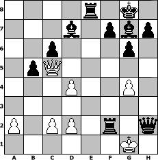 game notation in PGN-format [Event "Herbstturnier"] [Site "www.myChess.de"] [Date "2004.11.18"] [Round "1"] [White "Goebi"] [Black "Joschi"] [ECO "A48"] [WhitemyELO "1479"] [BlackmyELO "1607"] [Result "0-1"] [TimeControl "10/864000"] [WhiteDays "14"] [BlackDays "35"] [MyChessNo "8194"] 1. d4 Nf6 2. Nf3 g6 3. Nc3 d5 4. Nb5 c6 5. Nc3 Bg7 6. e3 O-O 7. Bd3 Re8 8. O-O Nbd7 9. b4 b5 10. Qe2 a5 11. bxa5 Rxa5 12. Ng5 Nb6 13. Qf3 Bg4 14. Qg3 Qa8 15. Qc7 Na4 16. Ba3 Nxc3 17. Bxe7 Ra7 18. Qd6 Raxe7 19. h3 Be6 20. g4 Nfe4 21. Nxe4 Nxe4 22. Qb4 Qb8 23. f3 Qg3+ 24. Kh1 Qxh3+ 25. Kg1 Qg3+ 26. Kh1 Nf2+ 27. Rxf2 Qxf2 28. Rf1 Qg3 29. Qc5 Bd7 30. e4 dxe4 31. Be2 exf3 32. Rxf3 Qh4+ 33. Kg2 Rxe2+ 34. Rf2 Rxf2+ 35. Kg1 Qh2# 0-1 position notation in FEN-format 4r1k1/3b1pbp/2p3p1/1pQ5/3P2P1/8/P1PP1r1q/6K1 - - - 2 36 Captured white pieces: Captured black pieces: Click on a captured piece in order to display the desired move!