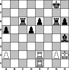 game notation in PGN-format [Event "Aufs neue Jahr!!!"] [Site "www.myChess.de"] [Date "2016.01.06"] [Round "1"] [White "Andylein1989"] [Black "Joschi"] [ECO "B10"] [WhitemyELO "1507"] [BlackmyELO "1565"] [Result "0-1"] [TimeControl "10/2592000"] [WhiteDays "132"] [BlackDays "150"] [MyChessNo "102012"] 1. e4 c6 2. Nf3 d5 3. exd5 cxd5 4. d4 Nc6 5. Bb5 Nf6 6. O-O Bd7 7. c3 e6 8. Re1 Be7 9. Nbd2 O-O 10. Nf1 a6 11. Ba4 b5 12. Bc2 Rc8 13. Ng3 Na5 14. Ne5 Nc4 15. Nxc4 Rxc4 16. Bd2 Qb6 17. Nh5 g6 18. Ng3 a5 19. Bh6 Rfc8 20. h4 Bf8 21. Bg5 Bg7 22. Qf3 Ne8 23. h5 h6 24. Be3 g5 25. Qg4 f5 26. Qf3 f4 27. Bxf4 gxf4 28. Qxf4 Nf6 29. Bg6 Be8 30. Re2 Bxg6 31. hxg6 b4 32. Qe5 R8c6 33. Rae1 bxc3 34. bxc3 Rxc3 35. f4 Rxg3 36. f5 Nh5 37. f6 Bxf6 38. Qxh5 Qxd4+ 39. Kh1 Qh4+ 40. Qxh4 Bxh4 41. Kh2 Rxg6 0-1 position notation in FEN-format 6k1/8/2r1p1rp/p2p4/7b/8/P3R1PK/4R3 - - - 0 42 Captured white pieces: Captured black pieces: Click on a captured piece in order to display the desired move!