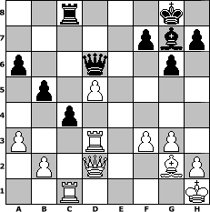 game notation in PGN-format [Event "Modernes Benoni"] [Site "www.myChess.de"] [Date "2010.01.14"] [Round "2"] [White "Robur"] [Black "kari6katz"] [ECO "A63"] [WhitemyELO "1799"] [BlackmyELO "1725"] [Result "1-0"] [TimeControl "10/2592000"] [WhiteDays "074"] [BlackDays "119"] [MyChessNo "62407"] 1. d4 Nf6 2. c4 c5 3. d5 e6 4. Nc3 exd5 5. cxd5 d6 6. Nf3 g6 7. g3 Bg7 8. Bg2 O-O 9. O-O a6 10. e4 b5 11. e5 dxe5 12. Nxe5 Re8 13. Nc6 Qd7 14. Bf4 Bb7 15. Nxb8 Raxb8 16. Bxb8 Rxb8 17. Rc1 c4 18. Qd2 Rd8 19. Rfd1 Qd6 20. Rc2 Bc8 21. Ne4 Nxe4 22. Bxe4 Re8 23. Bg2 Bf5 24. Rcc1 Qf6 25. Re1 Rc8 26. Re2 Bg4 27. f3 Bd7 28. a3 Qd6 29. Kh1 Bf5 30. Re3 Bd3 31. Rxd3 1-0 position notation in FEN-format 2r3k1/5pbp/p2q2p1/1p1P4/2p5/P2R1PP1/1P1Q2BP/2R4K - - - 0 31 Captured white pieces: Captured black pieces: Click on a captured piece in order to display the desired move!
