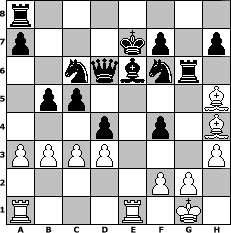 game notation in PGN-format [Event "Albspiele 4"] [Site "www.myChess.de"] [Date "2010.05.30"] [Round "1"] [White "Haki"] [Black "muellerh"] [ECO "C00"] [WhitemyELO "1225"] [BlackmyELO "1418"] [Result "0-1"] [TimeControl "10/2592000"] [WhiteDays "30"] [BlackDays "30"] [MyChessNo "65856"] 1. e4 e6 2. d3 c5 3. Nf3 d5 4. Nbd2 Nc6 5. Be2 Bd6 6. O-O Nf6 7. h3 Qc7 8. c3 O-O 9. Re1 d4 10. Nc4 Rd8 11. Nxd6 Qxd6 12. Qd2 e5 13. b3 b5 14. a3 Bb7 15. Nh4 g6 16. Nf5 gxf5 17. Qg5+ Kf8 18. Qh6+ Ke7 19. exf5 Rg8 20. Bg5 Bc8 21. Bh4 Bxf5 22. Bf3 Rg6 23. Qf4 Be6 24. Bh5 exf4 0-1 position notation in FEN-format r7/p3kp1p/2nqbnr1/1pp4B/3p1p1B/PPPP3P/5PP1/R3R1K1 - - - 0 25 Captured white pieces: Captured black pieces: Click on a captured piece in order to display the desired move!