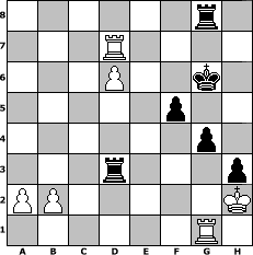 game notation in PGN-format [Event "Sommerzeit"] [Site "www.myChess.de"] [Date "2008.06.01"] [Round "1"] [White "muetoe"] [Black "dbuse"] [ECO "A34"] [WhitemyELO "1907"] [BlackmyELO "1881"] [Result "0-1"] [TimeControl "10/864000"] [WhiteDays "45"] [BlackDays "47"] [MyChessNo "45276"] 1. c4 c5 2. Nc3 Nf6 3. Nf3 d5 4. cxd5 Nxd5 5. g3 Nc6 6. Bg2 Nc7 7. O-O e5 8. d3 Be7 9. Nd2 Bd7 10. Nc4 f6 11. f4 b5 12. Ne3 exf4 13. gxf4 Rb8 14. Ned5 Nxd5 15. Nxd5 O-O 16. Be3 Nd4 17. Qd2 Kh8 18. Bf2 Bc6 19. e4 Bd6 20. Rfe1 a5 21. Rac1 Qd7 22. Be3 Bxd5 23. exd5 Qf5 24. Qxa5 Bxf4 25. Rxc5 Be5 26. Qb4 Rbe8 27. Kh1 Nf3 28. Rf1 Qh5 29. h3 Nh2 30. Rc1 Bd6 31. Qd2 Nf3 32. Qe2 Qe5 33. Bxf3 Qxe3 34. Qxe3 Rxe3 35. Rc6 Rxf3 36. Rxd6 Rxh3+ 37. Kg2 Rxd3 38. Rc2 h5 39. Rd7 Kh7 40. Rcc7 Rg8 41. Rb7 h4 42. d6 Kh6 43. Rxb5 g5 44. Rf5 h3+ 45. Kh2 Kg6 46. Rf1 g4 47. Rg1 f5 0-1 position notation in FEN-format 6r1/3R4/3P2k1/5p2/6p1/3r3p/PP5K/6R1 - - - 0 48 Captured white pieces: Captured black pieces: Click on a captured piece in order to display the desired move!