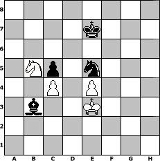 game notation in PGN-format [Event "mal was andres"] [Site "www.myChess.de"] [Date "2008.12.19"] [Round "1"] [White "murphy12"] [Black "Robur"] [ECO "A40"] [WhitemyELO "1647"] [BlackmyELO "1706"] [Result "0-1"] [TimeControl "10/2592000"] [WhiteDays "178"] [BlackDays "137"] [MyChessNo "50840"] 1. d4 g6 2. c4 Nh6 3. Nc3 f5 4. Bg5 Nf7 5. h4 Bg7 6. Nf3 h6 7. Bf4 d6 8. e4 O-O 9. Bd3 Na6 10. a3 e5 11. dxe5 dxe5 12. Bg3 Nc5 13. Bc2 f4 14. Bh2 Bg4 15. Qxd8 Rfxd8 16. Nd2 Nd3+ 17. Bxd3 Rxd3 18. f3 Be6 19. O-O-O c6 20. Kc2 Rad8 21. Rhe1 Bf6 22. g3 fxg3 23. Bxg3 R3d7 24. b3 Be7 25. a4 g5 26. hxg5 Bxg5 27. Nf1 h5 28. Rxd7 Rxd7 29. Bf2 b6 30. Be3 h4 31. Ne2 h3 32. f4 Bh4 33. Rd1 Rxd1 34. Kxd1 Bg4 35. Kd2 exf4 36. Nxf4 Ng5 37. Kd3 Nf3 38. a5 bxa5 39. Bxa7 h2 40. Nxh2 Nxh2 41. Ng6 Bf6 42. Bb6 Kf7 43. Nf4 Bd1 44. Bxa5 Bxb3 45. Ne2 Nf3 46. Bc3 c5 47. Ke3 Bxc3 48. Nxc3 Ne5 49. Nb5 Ke7 0-1 position notation in FEN-format 8/4k3/8/1Np1n3/2P1P3/1b2K3/8/8 - - - 3 50 Captured white pieces: Captured black pieces: Click on a captured piece in order to display the desired move!