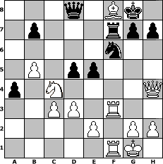 game notation in PGN-format [Event "Neue Reihe: sch"] [Site "www.myChess.de"] [Date "2009.05.15"] [Round "1"] [White "Baehr008"] [Black "bane"] [ECO "C51"] [WhitemyELO "2101"] [BlackmyELO "1819"] [Result "1-0"] [TimeControl "10/2592000"] [WhiteDays "28"] [BlackDays "29"] [MyChessNo "55704"] 1. e4 e5 2. Nf3 Nc6 3. Bc4 Bc5 4. b4 Bxf2+ 5. Kxf2 Nf6 6. Re1 O-O 7. Kg1 d6 8. c3 Bg4 9. d3 Qe7 10. Rf1 a5 11. b5 Nd8 12. Qe1 Ne6 13. Qg3 c6 14. a4 Rad8 15. Bxe6 fxe6 16. Bg5 Bxf3 17. Rxf3 Rf7 18. Nd2 Rdf8 19. Raf1 cxb5 20. axb5 Kh8 21. Qh4 Kg8 22. Nc4 a4 23. Bc1 Qc7 24. Ba3 d5 25. Bd6 Qd8 26. exd5 exd5 27. Bxf8 1-0 position notation in FEN-format 3q1Bk1/1p3rpp/5n2/1P1pp3/p1N4Q/2PP1R2/4P1PP/5RK1 - - - 0 27 Captured white pieces: ![]() ![]() ![]() ![]() ![]() ![]() ![]() ![]() ![]() ![]() ![]() ![]() ![]() ![]() ![]() Captured black pieces: ![]() ![]() ![]() ![]() ![]() ![]() ![]() ![]() ![]() ![]() ![]() ![]() ![]() ![]() ![]() Click on a captured piece in order to display the desired move!