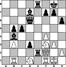 game notation in PGN-format [Event "Auf ein Neues 2"] [Site "www.myChess.de"] [Date "2021.03.20"] [Round "1"] [White "beowulf"] [Black "Helmut48"] [ECO "A22"] [WhitemyELO "1411"] [BlackmyELO "2021"] [Result "0-1"] [TimeControl "10/2592000"] [WhiteDays "117"] [BlackDays "118"] [MyChessNo "121563"] 1. c4 e5 2. Nc3 Nf6 3. Nf3 Nc6 4. g3 d5 5. d3 d4 6. Na4 a6 7. b3 b5 8. Nb2 Bb4+ 9. Bd2 Ba3 10. Rb1 O-O 11. Bg2 Rb8 12. O-O Qd6 13. Qc2 Bd7 14. Nd1 Nb4 15. Bxb4 Bxb4 16. e3 h6 17. exd4 exd4 18. Qc1 Rfe8 19. a3 Bxa3 20. Qd2 c5 21. Nb2 Bb4 22. Qc2 Nh7 23. cxb5 axb5 24. Nh4 Re7 25. Be4 Rbe8 26. Nd1 Ng5 27. f4 Nxe4 28. dxe4 d3 29. Qf2 Rxe4 30. Nf3 Re2 0-1 position notation in FEN-format 4r1k1/3b1pp1/3q3p/1pp5/1b3P2/1P1p1NP1/4rQ1P/1R1N1RK1 - - - 2 31 Captured white pieces: Captured black pieces: Click on a captured piece in order to display the desired move!