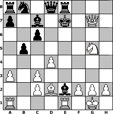 game notation in PGN-format [Event "Mammut"] [Site "www.myChess.de"] [Date "2010.07.01"] [Round "2"] [White "bruno"] [Black "neve"] [ECO "A22"] [WhitemyELO "1752"] [BlackmyELO "1538"] [Result "1-0"] [TimeControl "10/2592000"] [WhiteDays "89"] [BlackDays "88"] [MyChessNo "66692"] 1. c4 e5 2. Nc3 Nf6 3. e3 c6 4. d4 exd4 5. exd4 d5 6. cxd5 Nxd5 7. Nf3 Bb4 8. Bd2 O-O 9. a3 Re8+ 10. Be2 Nxc3 11. bxc3 Ba5 12. O-O Bg4 13. Re1 Bc7 14. Qb3 b5 15. Ng5 Bxe2 16. Qxf7+ Kh8 17. Qf5 Kg8 18. Qxh7+ Kf8 19. Qh8+ Ke7 20. Qxg7+ 1-0 position notation in FEN-format rn1qr3/p1b1k1Q1/2p5/1p4N1/3P4/P1P5/2PBbPPP/R3R1K1 - - - 0 20 Captured white pieces: Captured black pieces: Click on a captured piece in order to display the desired move!