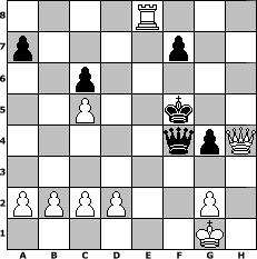 game notation in PGN-format [Event "15. HK-Turnier"] [Site "www.myChess.de"] [Date "2013.03.01"] [Round "2"] [White "Knight"] [Black "beowulf"] [ECO "D00"] [WhitemyELO "1207"] [BlackmyELO "1414"] [Result "1/2-1/2"] [TimeControl "10/1728000"] [WhiteDays "20"] [BlackDays "20"] [MyChessNo "86892"] 1. d4 d5 2. e4 c6 3. Nc3 dxe4 4. Nxe4 g6 5. Nf3 Bg7 6. Be2 Bf5 7. Bd3 Nd7 8. O-O e5 9. Nd6+ Kf8 10. Nxb7 Qc7 11. Bxf5 gxf5 12. Nc5 Nxc5 13. dxc5 Rd8 14. Qe2 e4 15. Nh4 Ne7 16. Be3 Be5 17. Bh6+ Ke8 18. Rfd1 Rxd1+ 19. Rxd1 Bxh2+ 20. Kh1 Bf4 21. Bg7 Rg8 22. Bf6 Rg4 23. f3 Bg5 24. fxg4 Bxf6 25. Qe1 fxg4 26. Rd6 Bxh4 27. Qxe4 Kf8 28. Qxh7 Ng6 29. Rxg6 Qf4 30. Rg8+ Ke7 31. Qxh4+ Ke6 32. Re8+ Kf5 33. Qh5+ Kf6 34. Qh4+ Kf5 35. Qh5+ Kf6 36. Qh4+ Kf5 37. Kg1 1/2-1/2 position notation in FEN-format 4R3/p4p2/2p5/2P2k2/5qpQ/8/PPPP2P1/6K1 - - - 12 37 Captured white pieces: Captured black pieces: Click on a captured piece in order to display the desired move!