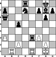 game notation in PGN-format [Event "Endspurt 2018"] [Site "www.myChess.de"] [Date "2018.11.09"] [Round "1"] [White "Master1"] [Black "miu"] [ECO "A45"] [WhitemyELO "1263"] [BlackmyELO "1592"] [Result "0-1"] [TimeControl "10/864000"] [WhiteDays "10"] [BlackDays "10"] [MyChessNo "113409"] 1. d4 Nf6 2. e3 g6 3. Bd3 Bg7 4. Nf3 O-O 5. O-O d6 6. Nbd2 Nbd7 7. Re1 c6 8. h3 b5 9. e4 e5 10. a3 exd4 11. Nxd4 Qb6 12. N2f3 Bb7 13. Be3 c5 14. Ne2 Nxe4 15. Rb1 Rfe8 16. b4 Qc6 17. bxc5 dxc5 18. Ng5 Nxg5 19. Nf4 Nxh3+ 20. Kf1 Nxf4 21. f3 Nxd3 22. Qxd3 Rad8 23. Qxb5 Ba6 24. Qxa6 Qxa6+ 25. Kg1 Rxe3 0-1 position notation in FEN-format 3r2k1/p2n1pbp/q5p1/2p5/8/P3rP2/2P3P1/1R2R1K1 - - - 0 26 Captured white pieces: Captured black pieces: Click on a captured piece in order to display the desired move!