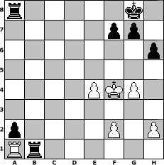 game notation in PGN-format [Event "2016"] [Site "www.myChess.de"] [Date "2016.01.01"] [Round "1"] [White "Master1"] [Black "alibengali"] [ECO "A45"] [WhitemyELO "1255"] [BlackmyELO "1621"] [Result "0-1"] [TimeControl "10/2592000"] [WhiteDays "24"] [BlackDays "30"] [MyChessNo "101968"] 1. d4 Nf6 2. e3 d5 3. Bd3 c5 4. c3 cxd4 5. cxd4 Nc6 6. Nf3 Bg4 7. Nbd2 h6 8. O-O e5 9. dxe5 Nxe5 10. Be2 Nxf3+ 11. Nxf3 Bd6 12. Nd4 Bxe2 13. Nxe2 O-O 14. Nd4 Qc7 15. g3 a6 16. Nf5 Rfe8 17. Nxd6 Qxd6 18. Re1 b5 19. Qf3 d4 20. Bd2 Ne4 21. Bc1 d3 22. Rd1 d2 23. b3 Qe5 24. Bxd2 Nxd2 25. Rxd2 Qxa1+ 26. Qd1 Qxd1+ 27. Rxd1 Red8 28. Rc1 Rd2 29. a3 Ra2 30. a4 bxa4 31. bxa4 Rxa4 32. Kg2 Rb4 33. Kf3 a5 34. g4 a4 35. e4 a3 36. Ra1 a2 37. Kf4 Rb1 0-1 position notation in FEN-format r5k1/5pp1/7p/8/4PKP1/8/p4P1P/Rr6 - - - 2 38 Captured white pieces: Captured black pieces: Click on a captured piece in order to display the desired move!