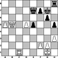 game notation in PGN-format [Event "Mal wieder spielen 2"] [Site "www.myChess.de"] [Date "2013.05.12"] [Round "1"] [White "FrankB"] [Black "Seneca"] [ECO "D02"] [WhitemyELO "1621"] [BlackmyELO "1570"] [Result "1-0"] [TimeControl "10/1728000"] [WhiteDays "104"] [BlackDays "117"] [MyChessNo "88250"] 1. d4 d5 2. Nf3 e6 3. c4 c6 4. Nc3 Nf6 5. e3 g6 6. Be2 Bg7 7. O-O O-O 8. Qc2 b6 9. a3 a5 10. b3 Bb7 11. Bb2 Nbd7 12. Rfc1 Re8 13. cxd5 cxd5 14. Bb5 Rc8 15. Qe2 Rc7 16. Na4 Ne4 17. Rxc7 Qxc7 18. Bxd7 Qxd7 19. Nxb6 Qc6 20. Na4 Ba6 21. Qd1 Rb8 22. Rb1 Bb5 23. Rc1 Qe8 24. Nc5 Nxc5 25. Rxc5 a4 26. b4 Bf8 27. Rc3 Bc4 28. Nd2 Bb5 29. Qc1 Bd6 30. Nf3 Qd8 31. Ne1 Kg7 32. Nd3 h5 33. Nc5 Qe7 34. h3 Qe8 35. Qc2 Qe7 36. Nexa4 Qd7 37. Nc5 Qe7 38. a4 Bc4 39. Ba3 Rc8 40. Qb2 Qa7 41. Qc2 Ra8 42. a5 Rb8 43. Qd2 Kh7 44. Rc2 Qe7 45. Rb2 Bb5 46. Rb1 Ra8 47. Qc3 Qc7 48. Bc1 Rc8 49. Bd2 Ra8 50. e4 dxe4 51. Nxe4 Qe7 52. d5 e5 53. Qe3 Rh8 54. Rc1 Kg7 55. Qb6 Bxb4 56. Qxb5 Bxd2 57. Nxd2 1-0 position notation in FEN-format 7r/4qpk1/6p1/PQ1Pp2p/8/7P/5PP1/2R3K1 - - - 0 57 Captured white pieces: Captured black pieces: Click on a captured piece in order to display the desired move!