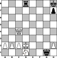 game notation in PGN-format [Event "BdF Chess960 - T960-S03"] [Site "www.myChess.de"] [Date "2006.11.12"] [Round "1"] [White "Knoeppel@"] [Black "Fernschachpost@"] [Variant "Fischerrandom"] [SetUp "1"] [FEN "brknnbrq/pppppppp/8/8/8/8/PPPPPPPP/BRKNNBRQ w KQkq - 0 1"] [WhitemyELO "1500"] [BlackmyELO "1500"] [Result "0-1"] [TimeControl "10/2592000"] [WhiteDays "070"] [BlackDays "116"] [MyChessNo "30105"] 1. b4 e6 2. e4 b5 3. g4 Nd6 4. Qf3 Bxe4 5. Qa3 Bb7 6. f4 Nc6 7. Qh3 Ra8 8. Bc3 Be7 9. Bd3 a5 10. bxa5 b4 11. a6 Bxa6 12. Bxb4 Nxb4 13. Rxb4 Bxd3 14. Nxd3 g5 15. Nc3 c6 16. Rb3 gxf4 17. Nxf4 Nc4 18. Nfe2 d5 19. Rf1 Qg7 20. Qf3 O-O 21. Nf4 Bg5 22. Rb4 f5 23. Rxc4 fxg4 24. Qxg4 dxc4 25. Qxe6+ Kh8 26. Qxc6 Qe5 27. Qxc4 Bxf4 28. Rf2 Rad8 29. Re2 Qg7 30. Rf2 Qg1+ 31. Nd1 Bxd2+ 32. Rxd2 Rxd2 33. Kxd2 Rd8+ 0-1 position notation in FEN-format 3r3k/7p/8/8/2Q5/8/PPPK3P/3N2q1 - - - 1 34 Captured white pieces: ![]() ![]() ![]() ![]() ![]() ![]() ![]() ![]() ![]() ![]() ![]() ![]() ![]() ![]() ![]() Captured black pieces: ![]() ![]() ![]() ![]() ![]() ![]() ![]() ![]() ![]() ![]() ![]() ![]() ![]() ![]() ![]() Click on a captured piece in order to display the desired move!