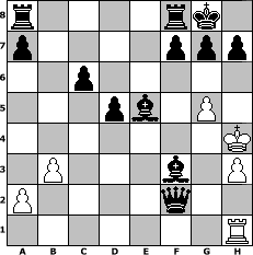 game notation in PGN-format [Event "Hertener Schachfreunde-Jahresstart"] [Site "www.myChess.de"] [Date "2012.02.01"] [Round "1"] [White "rikilatic"] [Black "Ziegert"] [ECO "B02"] [WhitemyELO "1471"] [BlackmyELO "1547"] [Result "0-1"] [TimeControl "10/2592000"] [WhiteDays "89"] [BlackDays "16"] [MyChessNo "79529"] 1. e4 Nf6 2. Qf3 e5 3. Bc4 c6 4. g4 d5 5. exd5 cxd5 6. Bb5+ Nc6 7. g5 e4 8. Qf4 Bd6 9. Bxc6+ bxc6 10. Qh4 Ng4 11. h3 Ne5 12. d4 exd3 13. cxd3 Nxd3+ 14. Kd2 Ne5 15. b3 O-O 16. Bb2 Qa5+ 17. Bc3 Qa6 18. Bxe5 Bxe5 19. Nc3 Bf5 20. Nge2 Qd3+ 21. Ke1 Bxc3+ 22. Kf1 Bxa1 23. Qg3 Qd1+ 24. Kg2 Be4+ 25. f3 Qxe2+ 26. Qf2 Bxf3+ 27. Kg3 Be5+ 28. Kh4 Qxf2# 0-1 position notation in FEN-format r4rk1/p4ppp/2p5/3pb1P1/7K/1P3b1P/P4q2/7R - - - 0 29 Captured white pieces: Captured black pieces: Click on a captured piece in order to display the desired move!