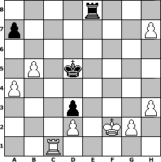 game notation in PGN-format [Event "Vorfreude auf die WM 2010"] [Site "www.myChess.de"] [Date "2010.05.08"] [Round "2"] [White "werderfan"] [Black "muellerh"] [ECO "A01"] [WhitemyELO "1548"] [BlackmyELO "1414"] [Result "1-0"] [TimeControl "10/864000"] [WhiteDays "40"] [BlackDays "21"] [MyChessNo "65411"] 1. b3 d5 2. Bb2 Nc6 3. e3 e5 4. Nf3 Bg4 5. h3 Bh5 6. Be2 e4 7. Nd4 Bxe2 8. Qxe2 Qd7 9. Nxc6 Qxc6 10. Nc3 Nf6 11. O-O Be7 12. f3 O-O 13. fxe4 dxe4 14. Rf2 b5 15. Nxb5 Qxc2 16. Bc3 c6 17. Nd4 Qd3 18. Qxd3 exd3 19. Nxc6 Nd5 20. Nxe7+ Nxe7 21. Bb4 Rfe8 22. Bxe7 Rxe7 23. Rc1 Rd8 24. Rf4 h6 25. Rfc4 f5 26. Rc7 Red7 27. b4 Kf8 28. a4 Re7 29. b5 f4 30. Rxe7 Kxe7 31. exf4 Ke6 32. Kf2 g5 33. fxg5 Kd5 34. gxh6 Re8 35. h7 1-0 position notation in FEN-format 4r3/p6P/8/1P1k4/P7/3p3P/3P1KP1/2R5 - - - 0 35 Captured white pieces: Captured black pieces: Click on a captured piece in order to display the desired move!