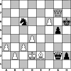 game notation in PGN-format [Event "Die letzten Sommertage!!!"] [Site "www.myChess.de"] [Date "2009.09.12"] [Round "1"] [White "sel"] [Black "Knight"] [ECO "A45"] [WhitemyELO "1385"] [BlackmyELO "1181"] [Result "1-0"] [TimeControl "10/864000"] [WhiteDays "38"] [BlackDays "38"] [MyChessNo "58972"] 1. d4 Nf6 2. Bg5 d5 3. Bxf6 exf6 4. a3 Nc6 5. e3 Bd6 6. Bb5 Bd7 7. Nc3 O-O 8. Bd3 Re8 9. Nf3 Bg4 10. h3 Bxf3 11. Qxf3 Qe7 12. O-O g6 13. Rae1 f5 14. g3 a5 15. Nb5 Nd8 16. Qxd5 c6 17. Qc4 cxb5 18. Qxb5 Nc6 19. c3 a4 20. e4 Qg5 21. exf5 Rxe1 22. Rxe1 Bxg3 23. fxg3 Qxg3+ 24. Kf1 Qxh3+ 25. Ke2 Re8+ 26. Kd2 Rxe1 27. Kxe1 g5 28. Kd2 Qg2+ 29. Be2 h5 30. Qxa4 h4 31. f6 h3 32. Qa8+ Kh7 33. Qxb7 h2 34. Qxf7+ Kh6 35. Qg7# 1-0 position notation in FEN-format 8/6Q1/2n2P1k/6p1/3P4/P1P5/1P1KB1qp/8 - - - 2 35 Captured white pieces: ![]() ![]() ![]() ![]() ![]() ![]() ![]() ![]() ![]() ![]() ![]() ![]() ![]() ![]() ![]() Captured black pieces: ![]() ![]() ![]() ![]() ![]() ![]() ![]() ![]() ![]() ![]() ![]() ![]() ![]() ![]() ![]() Click on a captured piece in order to display the desired move!