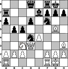 game notation in PGN-format [Event "unter uns Nr. 26"] [Site "www.myChess.de"] [Date "2015.02.14"] [Round "1"] [White "LouisaN"] [Black "Schefsche"] [ECO "C41"] [WhitemyELO "1444"] [BlackmyELO "1397"] [Result "0-1"] [TimeControl "10/864000"] [WhiteDays "17"] [BlackDays "20"] [MyChessNo "98114"] 1. e4 e5 2. Nf3 d6 3. d4 Bg4 4. Be2 Bxf3 5. Bxf3 exd4 6. Qxd4 Nc6 7. Qa4 a6 8. O-O b5 9. Qb3 Nd4 10. Qd3 c5 11. Nc3 Be7 12. Bg4 Nf6 13. Bh3 O-O 14. Bg5 Ra7 0-1 position notation in FEN-format 3q1rk1/r3bppp/p2p1n2/1pp3B1/3nP3/2NQ3B/PPP2PPP/R4RK1 - - - 8 15 Captured white pieces: ![]() ![]() ![]() ![]() ![]() ![]() ![]() ![]() ![]() ![]() ![]() ![]() ![]() ![]() ![]() Captured black pieces: ![]() ![]() ![]() ![]() ![]() ![]() ![]() ![]() ![]() ![]() ![]() ![]() ![]() ![]() ![]() Click on a captured piece in order to display the desired move!