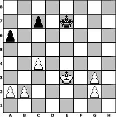 game notation in PGN-format [Event "1. HSF-Clubmeisterschaft, Vorrunde A"] [Site "www.myChess.de"] [Date "2010.09.01"] [Round "1"] [White "schoemi"] [Black "lotchi"] [ECO "D00"] [WhitemyELO "1541"] [BlackmyELO "1331"] [Result "1-0"] [TimeControl "10/2592000"] [WhiteDays "29"] [BlackDays "30"] [MyChessNo "68005"] 1. d4 d5 2. e4 e5 3. dxe5 dxe4 4. Qxd8+ Kxd8 5. Bg5+ f6 6. exf6 gxf6 7. Bh4 Bb4+ 8. c3 Bd6 9. Nd2 Bf5 10. O-O-O Nc6 11. Bb5 a6 12. Bxc6 bxc6 13. Ne2 c5 14. Ng3 Be6 15. Ndxe4 Ke7 16. Nh5 Be5 17. Nxc5 Bg4 18. Rde1 Bxh5 19. f4 Kd6 20. Ne4+ Ke6 21. fxe5 fxe5 22. Rhf1 Bg6 23. Ng5+ Kd5 24. Rd1+ Kc6 25. Bg3 e4 26. Be5 h6 27. Bxh8 hxg5 28. Bf6 g4 29. Rf4 Re8 30. Bd4 g3 31. hxg3 Bh5 32. Re1 Bg6 33. Kd2 Rd8 34. Ke3 Ne7 35. Kf2 Kd5 36. Bf6 Re8 37. c4+ Ke6 38. Bxe7 Rxe7 39. Rfxe4+ Bxe4 40. Rxe4+ Kf6 41. Rxe7 Kxe7 42. Ke3 1-0 position notation in FEN-format 8/2p1k3/p7/8/2P5/4K1P1/PP4P1/8 - - - 1 42 Captured white pieces: ![]() ![]() ![]() ![]() ![]() ![]() ![]() ![]() ![]() ![]() ![]() ![]() ![]() ![]() ![]() Captured black pieces: ![]() ![]() ![]() ![]() ![]() ![]() ![]() ![]() ![]() ![]() ![]() ![]() ![]() ![]() ![]() Click on a captured piece in order to display the desired move!