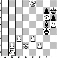 game notation in PGN-format [Event "unter uns Nr. 27 (Maiturnier)"] [Site "www.myChess.de"] [Date "2015.05.03"] [Round "1"] [White "Geisterreiter"] [Black "Winston"] [ECO "A00"] [WhitemyELO "1435"] [BlackmyELO "1423"] [Result "1-0"] [TimeControl "10/864000"] [WhiteDays "50"] [BlackDays "50"] [MyChessNo "99110"] 1. Nc3 d5 2. d4 h6 3. Nf3 Nc6 4. Bf4 Nf6 5. Nb5 e5 6. dxe5 Ne4 7. e6 Bd6 8. exf7+ Kxf7 9. Qxd5+ Be6 10. Qxe4 Re8 11. O-O-O Bxa2 12. Qf5+ Kg8 13. h4 Rf8 14. Qg4 Rxf4 15. Qh3 Qe7 16. e3 Be6 17. Qg3 Ra4 18. Qg6 Ra1+ 19. Kd2 Bb4+ 20. c3 Rd8+ 21. Bd3 Rxd1+ 22. Rxd1 Ba5 23. Ke2 a6 24. Bf5 Bc4+ 25. Bd3 Bxb5 26. Bxb5 axb5 27. Qc2 Rf8 28. Qb3+ Kh8 29. Qxb5 Bb6 30. Rd5 Qe8 31. Qd3 Rf6 32. Rd7 Rf7 33. Rd5 Re7 34. Rf5 Rd7 35. Qc2 Ne7 36. Rf4 c6 37. Qe4 Qd8 38. Rf7 Qg8 39. Rxe7 Rxe7 40. Qxe7 Qc8 41. Ne5 Kh7 42. Qb4 Bd8 43. Qe4+ Kg8 44. Ng6 Qd7 45. g4 c5 46. h5 Bg5 47. Qc4+ Qf7 48. Qxc5 Kh7 49. Qc8 Qg8 50. Qxb7 Qc4+ 51. Kd2 Qxg4 52. Qh1 Bf6 53. Nf4 Bg5 54. Qe4+ Kg8 55. Qe8+ Kh7 56. Ng6 1-0 position notation in FEN-format 4Q3/6pk/6Np/6bP/6q1/2P1P3/1P1K1P2/1N6 - - - 9 56 Captured white pieces: Captured black pieces: Click on a captured piece in order to display the desired move!