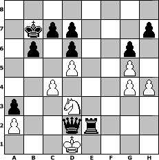 game notation in PGN-format [Event "Myschach 960er Blitz-Open"] [Site "www.myChess.de"] [Date "2006.02.28"] [Round "1"] [White "Jolilein"] [Black "bane"] [Variant "Fischerrandom"] [SetUp "1"] [FEN "qnnrkrbb/pppppppp/8/8/8/8/PPPPPPPP/QNNRKRBB w KQkq - 0 1"] [WhitemyELO "1239"] [BlackmyELO "1918"] [Result "0-1"] [TimeControl "10/86400"] [WhiteDays "03"] [BlackDays "02"] [MyChessNo "23081"] 1. b3 f5 2. f4 Bd5 3. c4 g6 4. Nc3 Be4 5. d4 b6 6. Rf3 Nd6 7. Rdd3 Nc6 8. d5 Nb4 9. Bd4 Nc2+ 10. Kd2 Nxa1 11. Bxh8 Rxh8 12. Nb5 O-O-O 13. Nxd6+ exd6 14. Rd4 Nc2 15. Rxe4 fxe4 16. Rg3 Nd4 17. e3 Nf5 18. Rg5 a5 19. g4 Nh6 20. Bxe4 Rde8 21. Kd3 a4 22. b4 Kb7 23. Ne2 Rxe4 24. Kxe4 Qe8+ 25. Kd4 Nf7 26. e4 Nxg5 27. fxg5 Qe7 28. h4 Re8 29. Kc3 Qxe4 30. Nc1 Qe1+ 31. Kb2 Qxb4+ 32. Kc2 a3 33. Nd3 Re2+ 34. Kd1 Qd2# 0-1 position notation in FEN-format 8/1kpp3p/1p1p2p1/3P2P1/2P3PP/p2N4/P2qr3/3K4 - - - 4 35 Captured white pieces: Captured black pieces: Click on a captured piece in order to display the desired move!