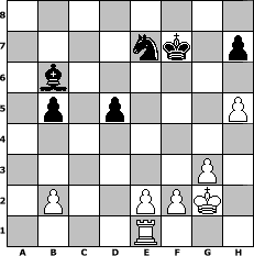 game notation in PGN-format [Event "Freibier f"] [Site "www.myChess.de"] [Date "2007.09.17"] [Round "1"] [White "Grubengeist"] [Black "muetoe"] [ECO "B40"] [WhitemyELO "1945"] [BlackmyELO "1815"] [Result "1/2-1/2"] [TimeControl "10/864000"] [WhiteDays "39"] [BlackDays "40"] [MyChessNo "38257"] 1. e4 c5 2. Nf3 e6 3. d3 Nc6 4. Nbd2 d5 5. g3 Bd6 6. Bg2 Nge7 7. O-O O-O 8. Re1 Bc7 9. c3 b6 10. e5 Ba6 11. Nf1 Qd7 12. d4 cxd4 13. cxd4 Rfc8 14. Ne3 Nb4 15. Bf1 Bxf1 16. Rxf1 a6 17. a3 Nbc6 18. Qd3 b5 19. Kg2 Bb6 20. h4 f6 21. exf6 gxf6 22. Ng4 Rf8 23. Bh6 e5 24. Bxf8 Rxf8 25. Nxf6+ Rxf6 26. dxe5 Rf5 27. a4 Nxe5 28. Nxe5 Rxe5 29. axb5 Qxb5 30. Qxb5 axb5 31. Rfe1 Rxe1 32. Rxe1 Kf7 33. h5 1/2-1/2 position notation in FEN-format 8/4nk1p/1b6/1p1p3P/8/6P1/1P2PPK1/4R3 - - - 0 33 Captured white pieces: Captured black pieces: Click on a captured piece in order to display the desired move!