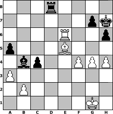 game notation in PGN-format [Event "Sommer Sonne Schach"] [Site "www.myChess.de"] [Date "2014.06.23"] [Round "2"] [White "wiesel"] [Black "Mattheus"] [ECO "A45"] [WhitemyELO "1240"] [BlackmyELO "1142"] [Result "1-0"] [TimeControl "10/1728000"] [WhiteDays "76"] [BlackDays "67"] [MyChessNo "94952"] 1. d4 Nf6 2. Nc3 d5 3. Nf3 Nc6 4. e3 e6 5. Bd3 Bb4 6. Bd2 O-O 7. O-O Re8 8. h3 e5 9. Re1 e4 10. Ng5 exd3 11. cxd3 h6 12. Nf3 Bgxc3 13. Bxc3 Be6 14. a3 a6 15. e4 dxe4 16. dxe4 Nh5 17. d5 Bxd5 18. Qxd5 Qxd5 19. exd5 Rxe1+ 20. Rxe1 Nd8 21. Re8+ Kh7 22. Ne5 Nf6 23. Re7 Nxd5 24. Rd7 f6 25. Rxd5 fxe5 26. Bxe5 c6 27. Rd7 Ne6 28. Rxb7 c5 29. f4 c4 30. g4 a5 31. Rb6 Re8 32. h4 Rd8 33. Rxe6 1-0 position notation in FEN-format 3r4/6pk/4R2p/p3B3/1bp2PPP/P7/1P6/6K1 - - - 0 33 Captured white pieces: Captured black pieces: Click on a captured piece in order to display the desired move!
