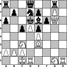 game notation in PGN-format [Event "Hitzeschlacht"] [Site "www.myChess.de"] [Date "2009.08.13"] [Round "1"] [White "ChrisKoenig"] [Black "Seneca"] [ECO "B07"] [WhitemyELO "1548"] [BlackmyELO "1456"] [Result "1-0"] [TimeControl "10/864000"] [WhiteDays "10"] [BlackDays "09"] [MyChessNo "58281"] 1. e4 d6 2. d4 Nf6 3. Nc3 g6 4. Be2 Bg7 5. g4 O-O 6. g5 Nfd7 7. h4 c5 8. d5 a6 9. h5 f6 10. hxg6 hxg6 11. Bh5 Ne5 12. f4 gxh5 13. Qxh5 Bg4 14. Qh7+ Kf7 15. fxe5 dxe5 16. g6+ Ke8 17. Qxg7 Kd7 18. Be3 Kd6 19. Qh7 Nd7 20. g7 Rg8 21. Qg6 Be6 22. O-O-O 1-0 position notation in FEN-format r2q2r1/1p1np1P1/p2kbpQ1/2pPp3/4P3/2N1B3/PPP5/2KR2NR - - - 4 22 Captured white pieces: Captured black pieces: Click on a captured piece in order to display the desired move!