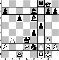 game notation in PGN-format [Event "reisinger"] [Site "www.myChess.de"] [Date "2010.08.09"] [Round "2"] [White "neve"] [Black "woern63"] [ECO "A92"] [WhitemyELO "1510"] [BlackmyELO "1514"] [Result "0-1"] [TimeControl "10/1728000"] [WhiteDays "20"] [BlackDays "20"] [MyChessNo "67560"] 1. d4 f5 2. c4 Nf6 3. g3 e6 4. Bg2 Be7 5. Nf3 O-O 6. O-O Ne4 7. Nfd2 d5 8. cxd5 exd5 9. Nc3 Be6 10. Qb3 Nc6 11. Qxb7 Nxd4 12. e3 Nc5 13. Qb4 Nc2 14. Qf4 Nxa1 15. Qf3 c6 16. Qd1 Ne4 17. Ndxe4 dxe4 18. Bd2 Qd3 19. Ne2 Rad8 20. Nd4 Rxd4 21. exd4 Nc2 22. b3 Nxd4 23. Qc1 Ne2+ 0-1 position notation in FEN-format 5rk1/p3b1pp/2p1b3/5p2/4p3/1P1q2P1/P2BnPBP/2Q2RK1 - - - 2 24 Captured white pieces: Captured black pieces: Click on a captured piece in order to display the desired move!