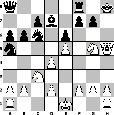 game notation in PGN-format [Event "Dabei ist alles 9"] [Site "www.myChess.de"] [Date "2010.03.22"] [Round "1"] [White "brucybabe"] [Black "Ostseeboy"] [ECO "D24"] [WhitemyELO "1671"] [BlackmyELO "1213"] [Result "1-0"] [TimeControl "10/864000"] [WhiteDays "10"] [BlackDays "10"] [MyChessNo "64212"] 1. d4 d5 2. c4 dxc4 3. Nf3 Nf6 4. Nc3 e6 5. Qa4+ Bd7 6. Qxc4 Be7 7. e4 O-O 8. Bd3 Nc6 9. Qb3 Na5 10. Qc2 b6 11. e5 Nd5 12. Bxh7+ Kh8 13. Be4 Nb4 14. Qe2 a6 15. Bxa8 Qxa8 16. Bg5 Bxg5 17. Nxg5 Nbc6 18. Qh5+ 1-0 position notation in FEN-format q4r1k/2pb1pp1/ppn1p3/n3P1NQ/3P4/2N5/PP1P1PPP/R3K2R - KQ - 2 18 Captured white pieces: Captured black pieces: Click on a captured piece in order to display the desired move!