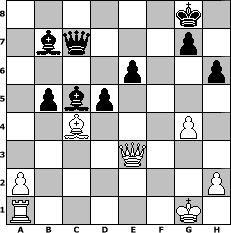 game notation in PGN-format [Event "Rechnerfrei B"] [Site "www.myChess.de"] [Date "2010.02.07"] [Round "1"] [White "rgHD"] [Black "Naunhofer"] [ECO "A15"] [WhitemyELO "1611"] [BlackmyELO "1580"] [Result "0-1"] [TimeControl "10/1728000"] [WhiteDays "58"] [BlackDays "79"] [MyChessNo "63017"] 1. c4 Nf6 2. g3 e6 3. Bg2 d5 4. d4 c6 5. Nf3 Nbd7 6. Bg5 Be7 7. c5 h6 8. Bf4 b6 9. b4 a5 10. Qa4 b5 11. Qb3 axb4 12. Qxb4 Nb6 13. Ne5 Bb7 14. O-O Nh5 15. Bd2 Ra4 16. Qc3 Nc4 17. f4 O-O 18. g4 Nf6 19. e3 Qc7 20. Rf3 Ne4 21. Qc2 Nxe5 22. fxe5 f6 23. Nc3 Rc4 24. Qb2 Nxd2 25. Qxd2 fxe5 26. Rxf8+ Bxf8 27. Bf1 exd4 28. Nxb5 cxb5 29. Bxc4 dxe3 30. Qxe3 Bxc5 0-1 position notation in FEN-format 6k1/1bq3p1/4p2p/1pbp4/2B3P1/4Q3/P6P/R5K1 - - - 0 31 Captured white pieces: ![]() ![]() ![]() ![]() ![]() ![]() ![]() ![]() ![]() ![]() ![]() ![]() ![]() ![]() ![]() Captured black pieces: ![]() ![]() ![]() ![]() ![]() ![]() ![]() ![]() ![]() ![]() ![]() ![]() ![]() ![]() ![]() Click on a captured piece in order to display the desired move!
