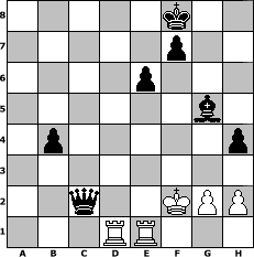 game notation in PGN-format [Event "Sizialianisch"] [Site "www.myChess.de"] [Date "2007.06.22"] [Round "1"] [White "ujack1961"] [Black "Grubengeist"] [ECO "B98"] [WhitemyELO "1801"] [BlackmyELO "1717"] [Result "0-1"] [TimeControl "10/864000"] [WhiteDays "40"] [BlackDays "40"] [MyChessNo "35824"] 1. e4 c5 2. Nf3 d6 3. d4 cxd4 4. Nxd4 Nf6 5. Nc3 a6 6. Bg5 e6 7. f4 Be7 8. Qf3 h6 9. Bh4 Nbd7 10. Be2 g5 11. fxg5 Ne5 12. Qe3 Nfg4 13. Qg1 hxg5 14. Bg3 Qc7 15. O-O-O b5 16. Nf3 b4 17. Na4 Bb7 18. Qd4 Rc8 19. Rd2 Qa5 20. Bxe5 Nxe5 21. Nxe5 Qxa4 22. Ng6 Qxa2 23. Rdd1 Rh4 24. Nxh4 gxh4 25. Kd2 Bg5+ 26. Ke1 Rxc2 27. Qxd6 Qxb2 28. Bb5+ axb5 29. Qb8+ Rc8 30. Qxb7 Qc3+ 31. Kf1 Qc4+ 32. Kf2 Qc2+ 33. Ke1 Kf8 34. Qxb5 Rc4 35. Qxc4 Qxc4 36. Kf2 Qxe4 37. Rhe1 Qc2+ 0-1 position notation in FEN-format 5k2/5p2/4p3/6b1/1p5p/8/2q2KPP/3RR3 - - - 2 38 Captured white pieces: ![]() ![]() ![]() ![]() ![]() ![]() ![]() ![]() ![]() ![]() ![]() ![]() ![]() ![]() ![]() Captured black pieces: ![]() ![]() ![]() ![]() ![]() ![]() ![]() ![]() ![]() ![]() ![]() ![]() ![]() ![]() ![]() Click on a captured piece in order to display the desired move!