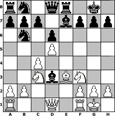 game notation in PGN-format [Event "RLT Robur +/-100"] [Site "www.myChess.de"] [Date "2005.03.25"] [Round "2"] [White "Nightflight"] [Black "Robur"] [ECO "B03"] [WhitemyELO "1550"] [BlackmyELO "1663"] [Result "0-1"] [TimeControl "10/2592000"] [WhiteDays "00"] [BlackDays "40"] [MyChessNo "11507"] 1. e4 Nf6 2. e5 Nd5 3. d4 d6 4. c4 Nb6 5. exd6 exd6 6. Nc3 Be7 7. Nf3 O-O 8. Be2 Re8 9. O-O Nc6 10. Be3 Bf5 11. d5 Nb8 12. Bd3 Bxd3 0-1 position notation in FEN-format rn1qr1k1/ppp1bppp/1n1p4/3P4/2P5/2NbBN2/PP3PPP/R2Q1RK1 - - - 0 13 Captured white pieces: Captured black pieces: Click on a captured piece in order to display the desired move!