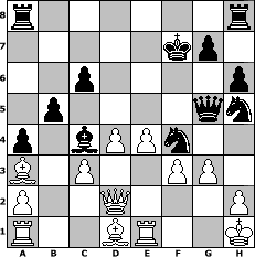 game notation in PGN-format [Event "Schlusslichterturnier Nr.2"] [Site "www.myChess.de"] [Date "2010.10.25"] [Round "1"] [White "Steffi"] [Black "Schachking"] [ECO "D20"] [WhitemyELO "1527"] [BlackmyELO "1539"] [Result "1-0"] [TimeControl "10/2592000"] [WhiteDays "07"] [BlackDays "30"] [MyChessNo "69321"] 1. d4 d5 2. c4 dxc4 3. Nc3 c6 4. e3 e6 5. Bxc4 Bb4 6. Nf3 Nf6 7. O-O Bxc3 8. bxc3 Nbd7 9. Ba3 b5 10. Bb3 a5 11. Ng5 h6 12. Nxe6 fxe6 13. Bxe6 Nf8 14. Bb3 Be6 15. Qf3 Bd5 16. Qg3 Kf7 17. Bc2 Be4 18. Bd1 a4 19. f3 Bd5 20. e4 Bc4 21. Re1 Ne6 22. Qf2 Nf4 23. Qd2 N6h5 24. g3 Qg5 25. Kh1 1-0 position notation in FEN-format r6r/5kp1/2p4p/1p4qn/p1bPPn2/B1P2PP1/P2Q3P/R2BR2K - - - 2 25 Captured white pieces: Captured black pieces: Click on a captured piece in order to display the desired move!