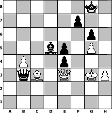 game notation in PGN-format [Event "Sommer 2010 Teil 2"] [Site "www.myChess.de"] [Date "2010.06.24"] [Round "1"] [White "BirdofPray1"] [Black "Holzhacker"] [ECO "B54"] [WhitemyELO "2192"] [BlackmyELO "2060"] [Result "1/2-1/2"] [TimeControl "10/1728000"] [WhiteDays "07"] [BlackDays "58"] [MyChessNo "66524"] 1. e4 c5 2. Nf3 d6 3. d4 cxd4 4. Nxd4 g6 5. c4 Bg7 6. Nc3 Nc6 7. Be3 Nf6 8. Be2 O-O 9. O-O Bd7 10. Qd2 Nxd4 11. Bxd4 Bc6 12. f3 a5 13. b3 Nd7 14. Be3 Be5 15. Rad1 Nc5 16. Nd5 e6 17. Nf4 Qc7 18. Nd3 Nxd3 19. Qxd3 Rfe8 20. f4 Bf6 21. Rfe1 Rad8 22. Bg4 Bh4 23. g3 Bf6 24. Rd2 Bg7 25. Bf2 Bf8 26. Rde2 a4 27. b4 Rc8 28. Bf3 Bd7 29. Rc1 e5 30. f5 b5 31. Rec2 bxc4 32. Rxc4 Qb7 33. fxg6 hxg6 34. Rxc8 Rxc8 35. Rxc8 Qxc8 36. a3 Qc1+ 37. Kg2 Be6 38. Bd1 d5 39. Bxa4 dxe4 40. Qe3 Qc4 41. h3 Qa2 42. g4 Bd5 43. g5 Be7 44. Kg3 Bxb4 45. axb4 Qxa4 46. Be1 Qd1 47. Bc3 Qb3 1/2-1/2 position notation in FEN-format 6k1/5p2/6p1/3bp1P1/1P2p3/1qB1Q1KP/8/8 - - - 4 48 Captured white pieces: Captured black pieces: Click on a captured piece in order to display the desired move!