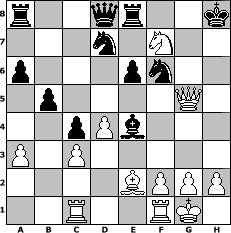 game notation in PGN-format [Event "QGD: Orthodox Verteidigung"] [Site "www.myChess.de"] [Date "2008.08.11"] [Round "1"] [White "andreas007"] [Black "scherry"] [ECO "D64"] [WhitemyELO "1391"] [BlackmyELO "1339"] [Result "1-0"] [TimeControl "10/2592000"] [WhiteDays "89"] [BlackDays "85"] [MyChessNo "47032"] 1. d4 d5 2. c4 e6 3. Nc3 Nf6 4. Bg5 Be7 5. e3 O-O 6. Nf3 Nbd7 7. Rc1 c6 8. Qc2 a6 9. Bd3 h6 10. Bf4 dxc4 11. Bxc4 Bb4 12. O-O b5 13. Bd3 Bb7 14. a3 Bxc3 15. bxc3 c5 16. e4 c4 17. Be2 Bxe4 18. Qd2 Re8 19. Ne5 g5 20. Bxg5 hxg5 21. Qxg5+ Kh8 22. Nxf7+ 1-0 position notation in FEN-format r2qr2k/3n1N2/p3pn2/1p4Q1/2pPb3/P1P5/4BPPP/2R2RK1 - - - 0 22 Captured white pieces: ![]() ![]() ![]() ![]() ![]() ![]() ![]() ![]() ![]() ![]() ![]() ![]() ![]() ![]() ![]() Captured black pieces: ![]() ![]() ![]() ![]() ![]() ![]() ![]() ![]() ![]() ![]() ![]() ![]() ![]() ![]() ![]() Click on a captured piece in order to display the desired move!