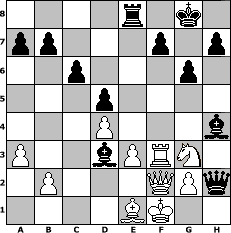 game notation in PGN-format [Event "Abtausch Variante"] [Site "www.myChess.de"] [Date "2007.02.05"] [Round "1"] [White "MartinSilies"] [Black "Baehr008"] [ECO "D35"] [WhitemyELO "1566"] [BlackmyELO "2198"] [Result "0-1"] [TimeControl "10/1728000"] [WhiteDays "18"] [BlackDays "60"] [MyChessNo "32299"] 1. d4 d5 2. c4 e6 3. Nc3 Nf6 4. cxd5 exd5 5. Nf3 Be7 6. e3 O-O 7. Bd3 Re8 8. O-O c6 9. Qc2 Bg4 10. Ne5 Be6 11. Bd2 Nbd7 12. Nxd7 Qxd7 13. f4 Qd6 14. f5 Bd7 15. Ne2 Bd8 16. Ng3 Ng4 17. Rf3 Bg5 18. Nf1 Nf6 19. a3 Ne4 20. Bxe4 Rxe4 21. Ng3 Rh4 22. Kf2 Rxh2 23. Rh1 Rxh1 24. Nxh1 Re8 25. Ng3 Bh4 26. Be1 Qh6 27. Ke2 Bg5 28. Bd2 Qh2 29. Kf2 Bh4 30. Be1 g6 31. Kf1 Bxf5 32. Qf2 Bd3+ 0-1 position notation in FEN-format 4r1k1/pp3p1p/2p3p1/3p4/3P3b/P2bPRN1/1P3QPq/4BK2 - - - 2 33 Captured white pieces: Captured black pieces: Click on a captured piece in order to display the desired move!