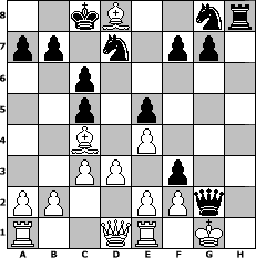 | game notation in PGN-format [Event "spass mit m"] [Site "www.myChess.de"] [Date "2005.03.21"] [Round "2"] [White "Sanji"] [Black "rikilatic"] [ECO "C40"] [WhitemyELO "1454"] [BlackmyELO "1420"] [Result "0-1"] [TimeControl "10/3456000"] [WhiteDays "80"] [BlackDays "75"] [MyChessNo "11360"] 1. e4 e5 2. Nf3 Qf6 3. Bc4 Bc5 4. d3 h6 5. Nc3 c6 6. O-O d6 7. Na4 Bg4 8. Nxc5 dxc5 9. Be3 Nd7 10. c3 h5 11. h3 O-O-O 12. hxg4 hxg4 13. Bg5 Qg6 14. Re1 gxf3 15. Bxd8 Qxg2# 0-1 position notation in FEN-format 2kB2nr/pp1n1pp1/2p5/2p1p3/2B1P3/2PP1p2/PP2PPq1/R2QR1K1 - - - 0 16 Captured white pieces:                              Captured black pieces:                               Click on a captured piece in order to display the desired move!