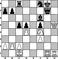 game notation in PGN-format [Event "friends 4"] [Site "www.myChess.de"] [Date "2007.07.20"] [Round "2"] [White "Shubaka"] [Black "ujack1961"] [ECO "A45"] [WhitemyELO "1500"] [BlackmyELO "1790"] [Result "1-0"] [TimeControl "10/864000"] [WhiteDays "10"] [BlackDays "10"] [MyChessNo "36594"] 1. d4 Nf6 2. Nc3 e6 3. e4 d6 4. Bd3 g6 5. f3 Nh5 6. Be3 Bg7 7. g4 Nf6 8. Qd2 O-O 9. h4 d5 10. e5 Nfd7 11. h5 Na6 12. hxg6 fxg6 13. Qh2 h5 14. Bxg6 h4 15. g5 Rf5 16. Bxf5 exf5 17. Qxh4 Nf8 18. Nge2 c6 19. O-O-O Be6 20. Nf4 Qe7 21. Qh5 Nc7 22. g6 c5 23. Bf2 Qd7 24. Bh4 Ne8 25. Nce2 Rc8 26. Nxe6 Qxe6 27. Nf4 Qd7 28. Bf6 Nxf6 29. exf6 Bxf6 30. g7 Qxg7 31. Rdg1 1-0 position notation in FEN-format 2r2nk1/pp4q1/5b2/2pp1p1Q/3P1N2/5P2/PPP5/2K3RR - - - 1 31 Captured white pieces: Captured black pieces: Click on a captured piece in order to display the desired move!